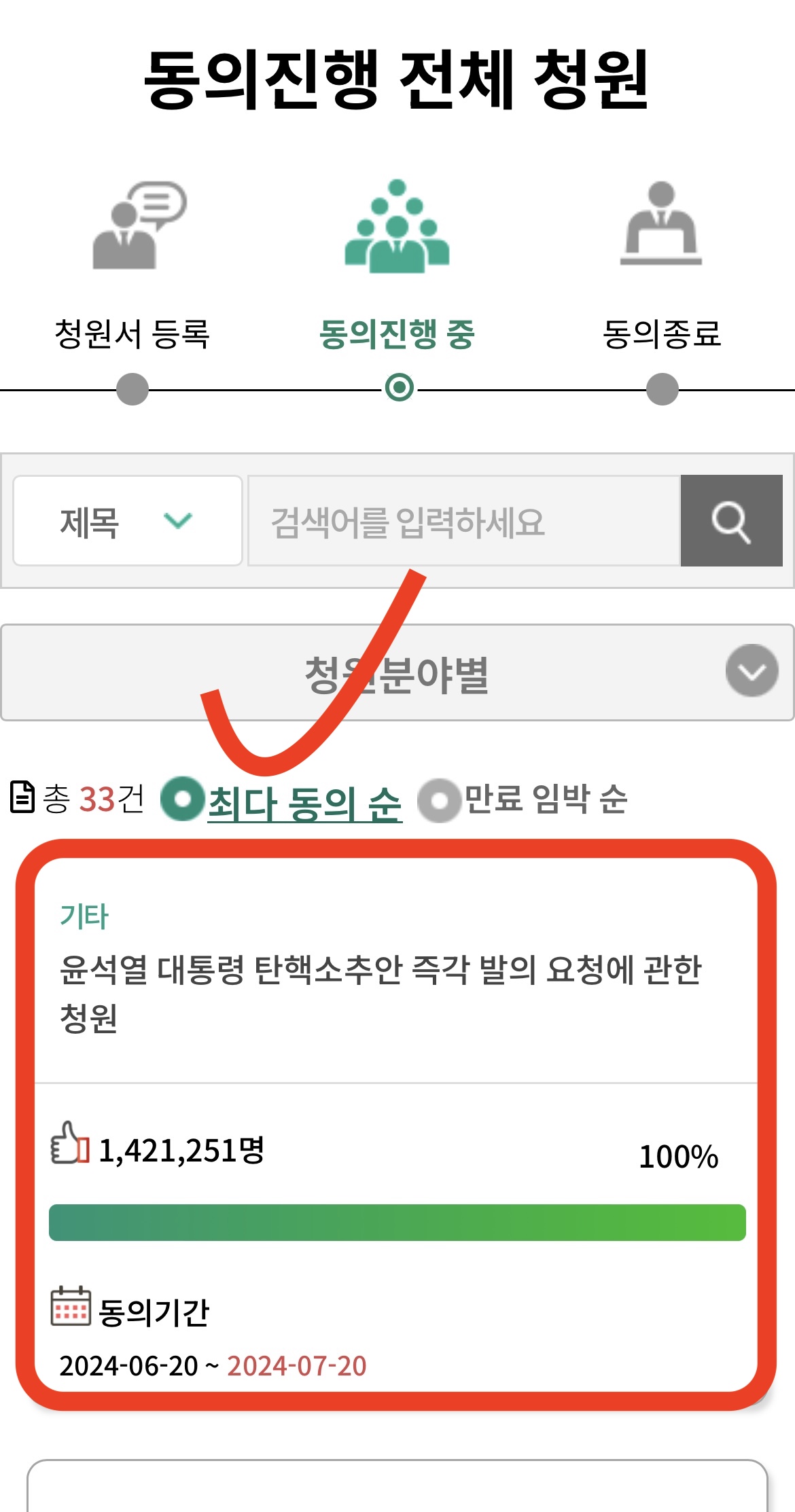 - 탄핵 관련 청원 검색: "최다 동의 순" 혹은 검색 기능을 사용해 윤석열 대통령 탄핵 관련 청원을 찾아주세요.